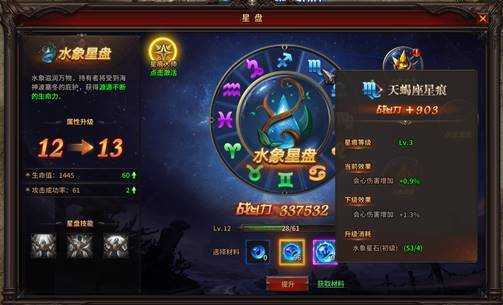 1) 通过星盘界面打开星痕功能,点击星痕按钮,即可打开对应的星痕界面,通过消耗材料提升星痕等级,获得极品属性,星痕的升级材料可以通过活动获得;