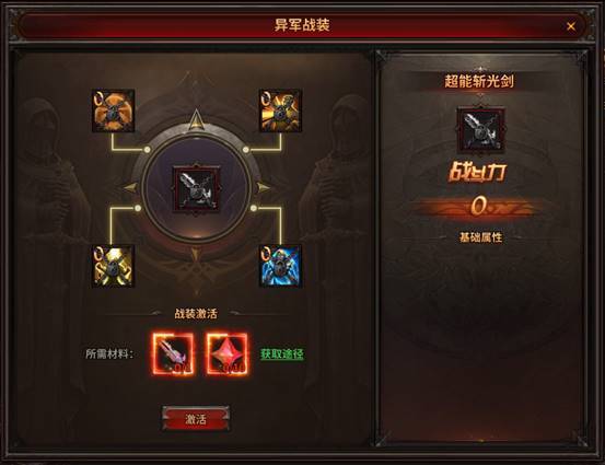 (2) 激活战装、提升战装科技可获得大量属性加成。凑齐成套的异军战装还可获得对应的套装属性